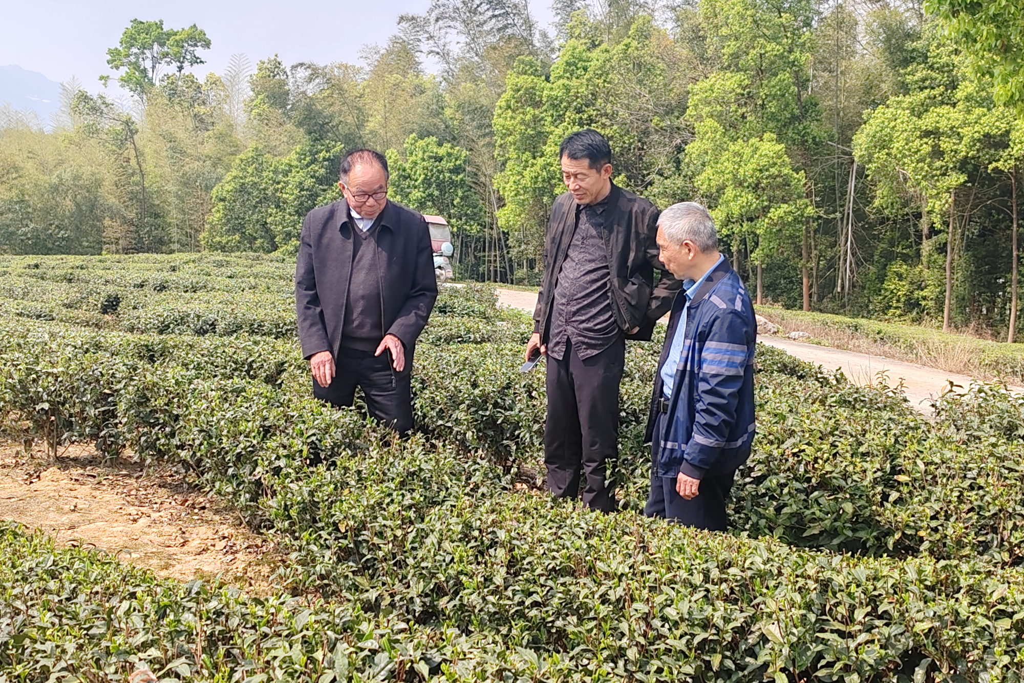 2025年4月8日,湖北省咸宁市通城县隽水镇油坊村,锦山基地茶场院士专家工作站省级科技特派员洪海林(右一)在茶园技术指导。