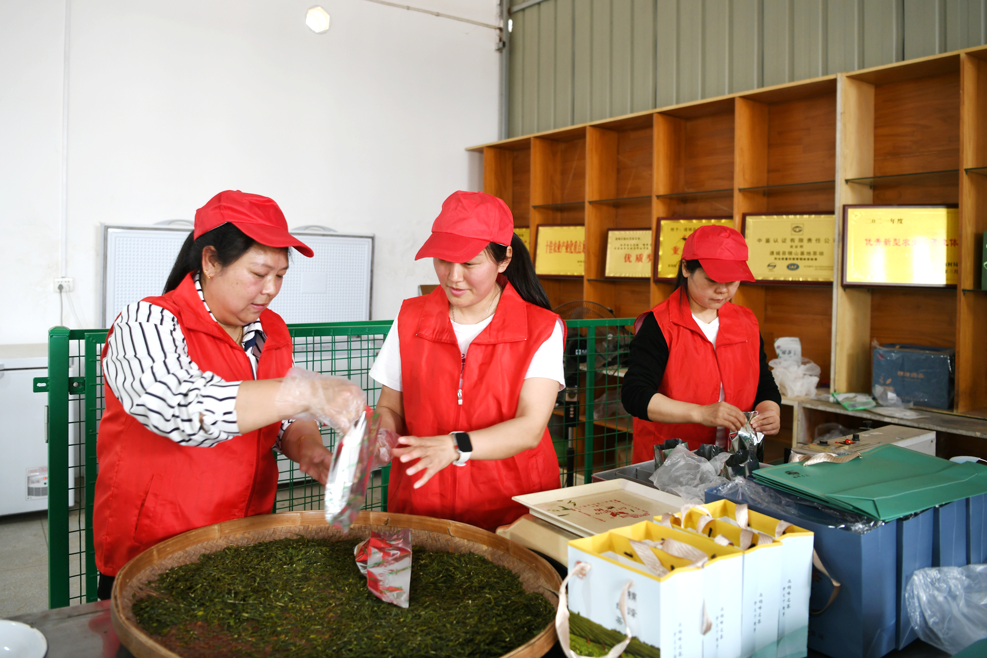 2025年4月8日,湖北省咸宁市通城县隽水镇油坊村,锦山基地茶场员工在良种茶园包装春茶,供应市场。