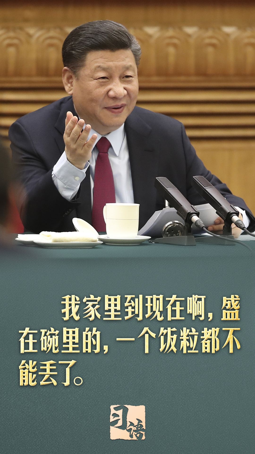 会场掌声、笑声激荡,总书记继续说道:“勤俭节约的习惯应该保留下去。我家里到现在啊,盛在碗里的,一个饭粒都不能丢了。从我父亲那时候传下来,糟蹋粮食良心上要受指责的。”