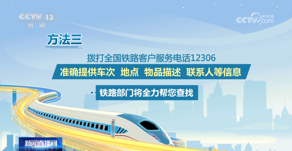 方法三:拨打全国铁路客户服务电话12306,准确提供车次、地点、物品描述、联系人等信息,铁路部门将全力帮您查找。