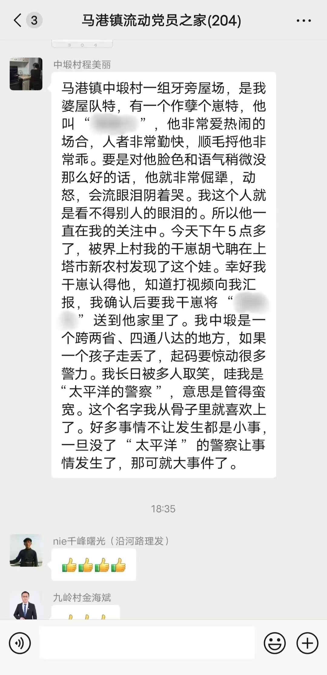 程美丽,作为中塅村的一名党员,平日里就古道热肠,对身边的人和事格外上心。4月14日,一件意外打破了村子的平静。村里有个叫凡凡的孩子,独自跑到了与本村交界且跨省的另一个村子玩耍。好在程美丽的熟人胡弋聃恰巧路过,发现了这个独自在外的孩子。