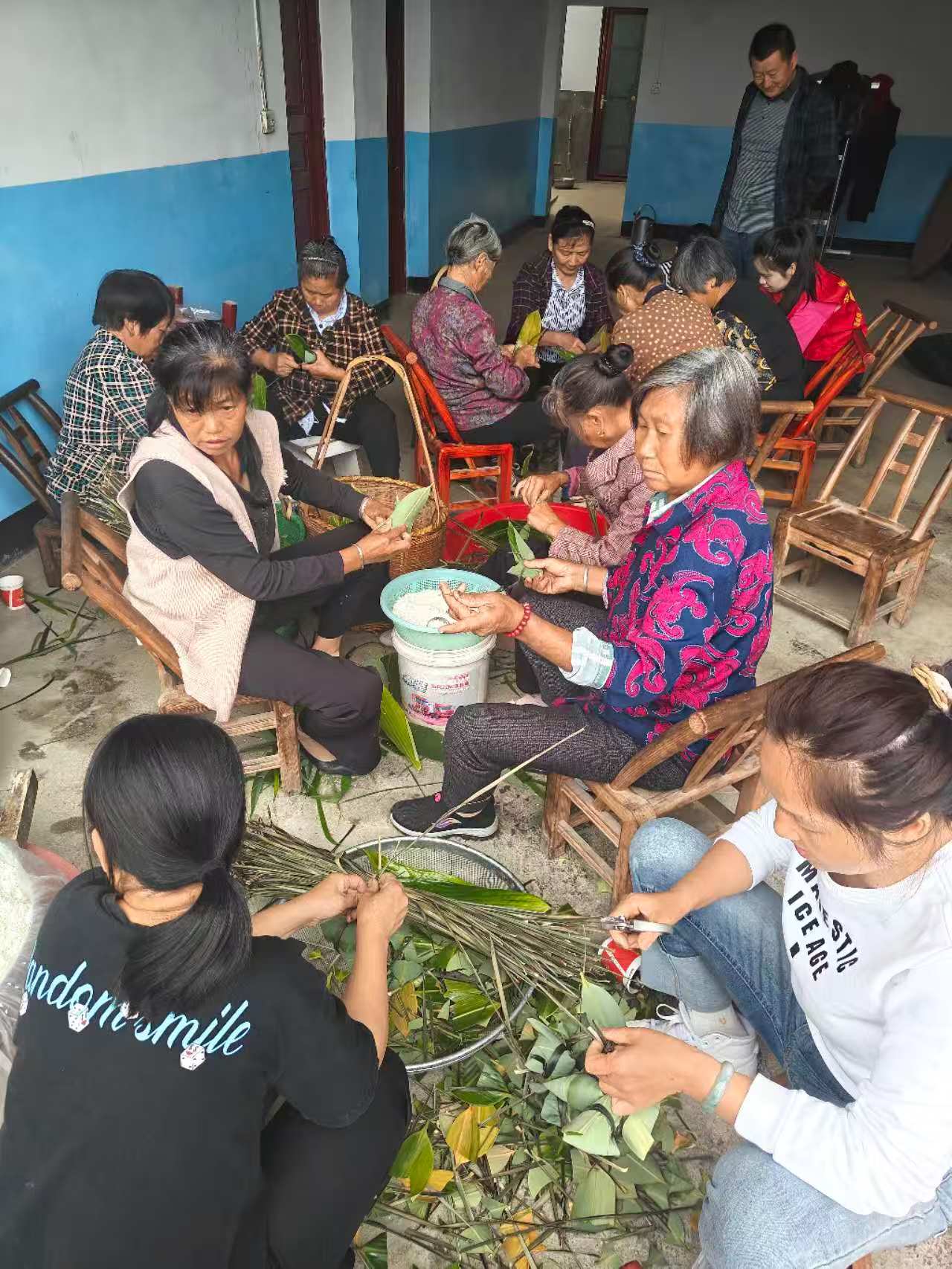 活动现场,老人们笑容满面、手法娴熟,大家自发组成三支队伍,一场紧张又欢乐的包粽子比赛正式拉开帷幕。“加油!再快点!”此起彼伏的助威声中,粽叶翻飞、棉线穿梭,大家你追我赶、默契配合,将糯米、红枣、腊肉等食材裹进清香的粽叶中,不一会儿,三角形、牛角形的粽子摆满箩筐。这场比赛不仅比出了速度,更赛出了润田村村民团结协作的精神风貌与和睦融洽的邻里氛围。