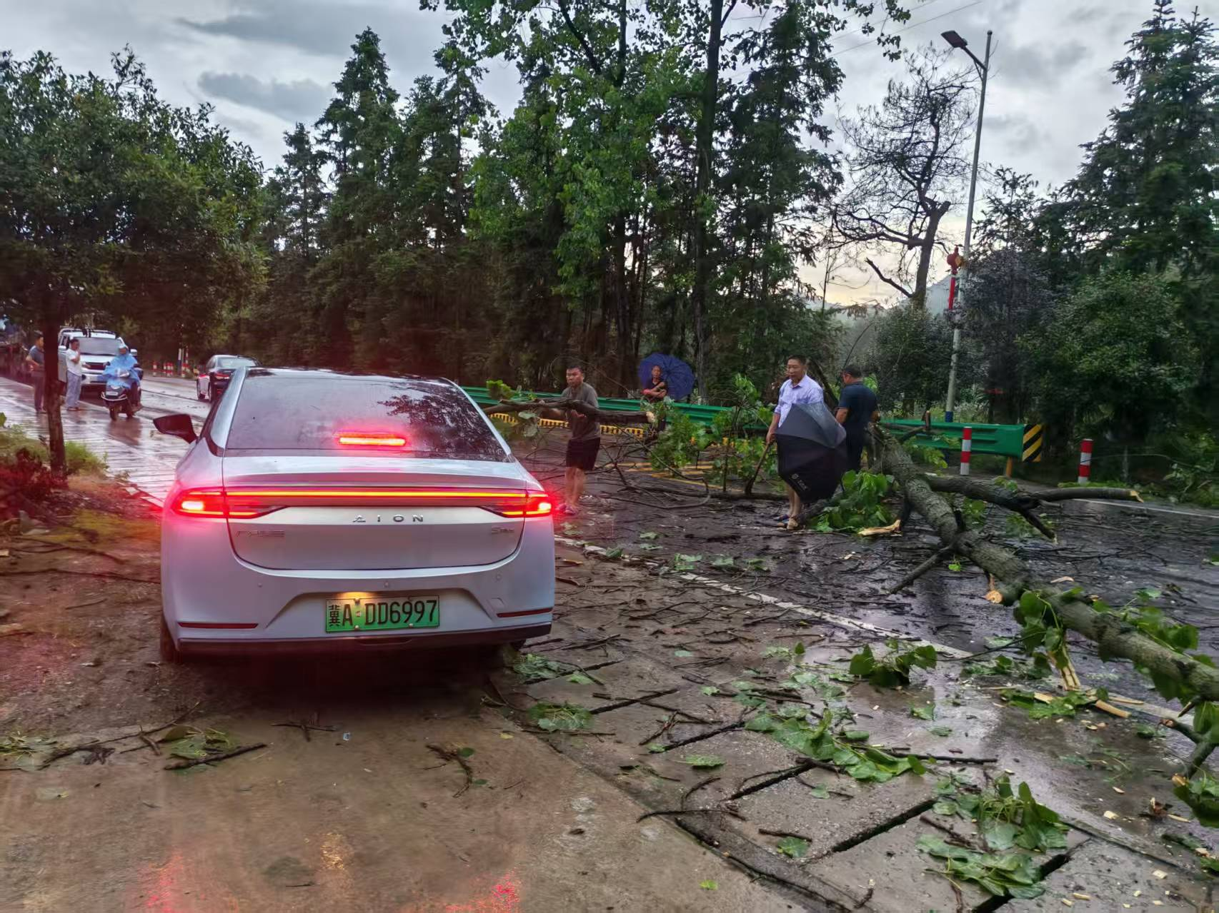 当日17:45许,短时强降雨与雷暴大风侵袭,风力迅速增强。G106国道马港段险情接连发生。沿线何婆桥村、九岭村、界上村均出现多处行道树倒伏,粗壮的树干横亘路面,严重阻断交通,对过往车辆和行人安全构成极大威胁。