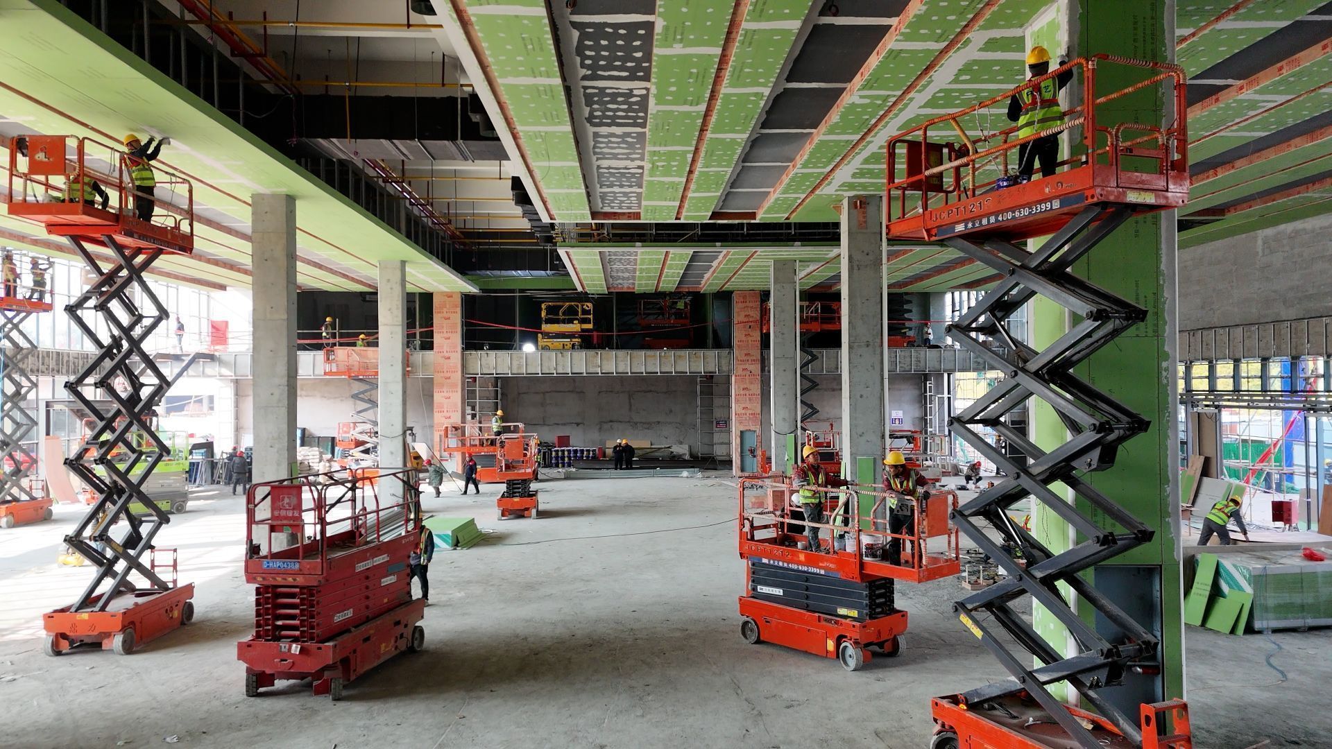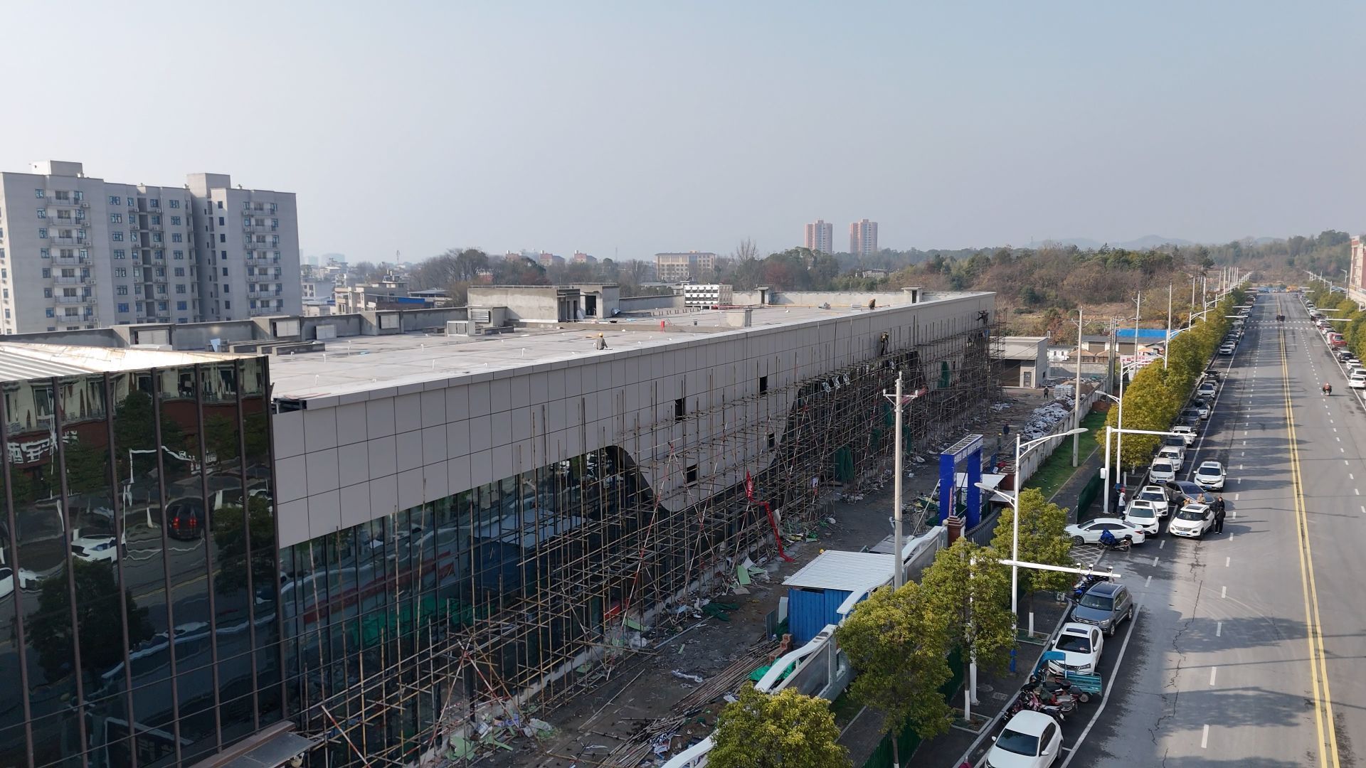 12月25日,在位于通城县客运中心西侧的中德联创(通城)新能源汽车产业园施工现场,百余名施工人员正有序作业,分散进行外墙玻璃安装和室内吊顶安装工作。
