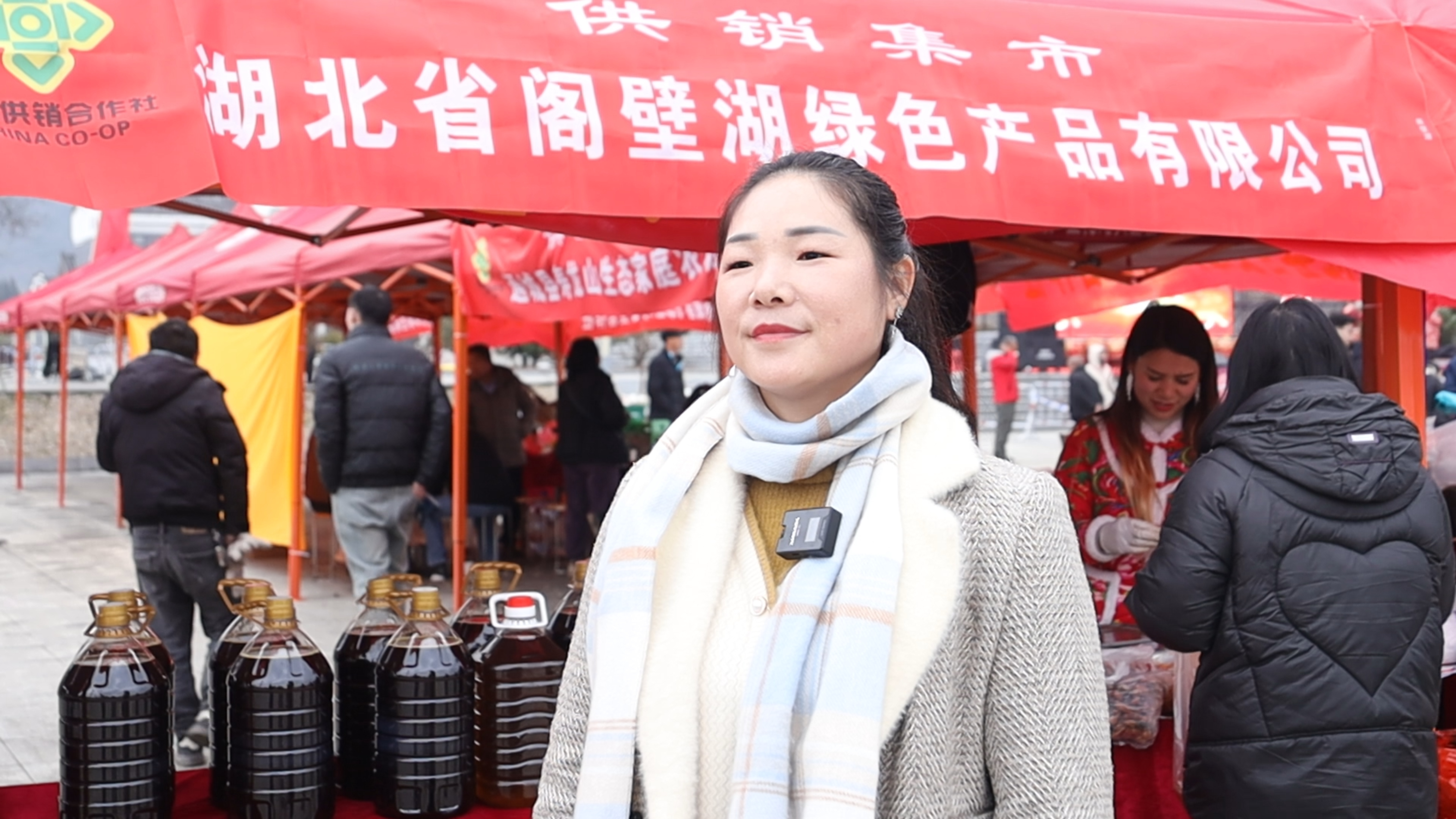 湖北省阁壁湖绿色产品有限公司负责人 卢熔:今天来到塘湖赶大集,现场热闹、客流很好,感谢政府给我们本地商户搭台。欢迎大家来逛大集、尝塘湖特产、选阁壁湖绿色茶油,支持本地绿色产业、支持乡村振兴!