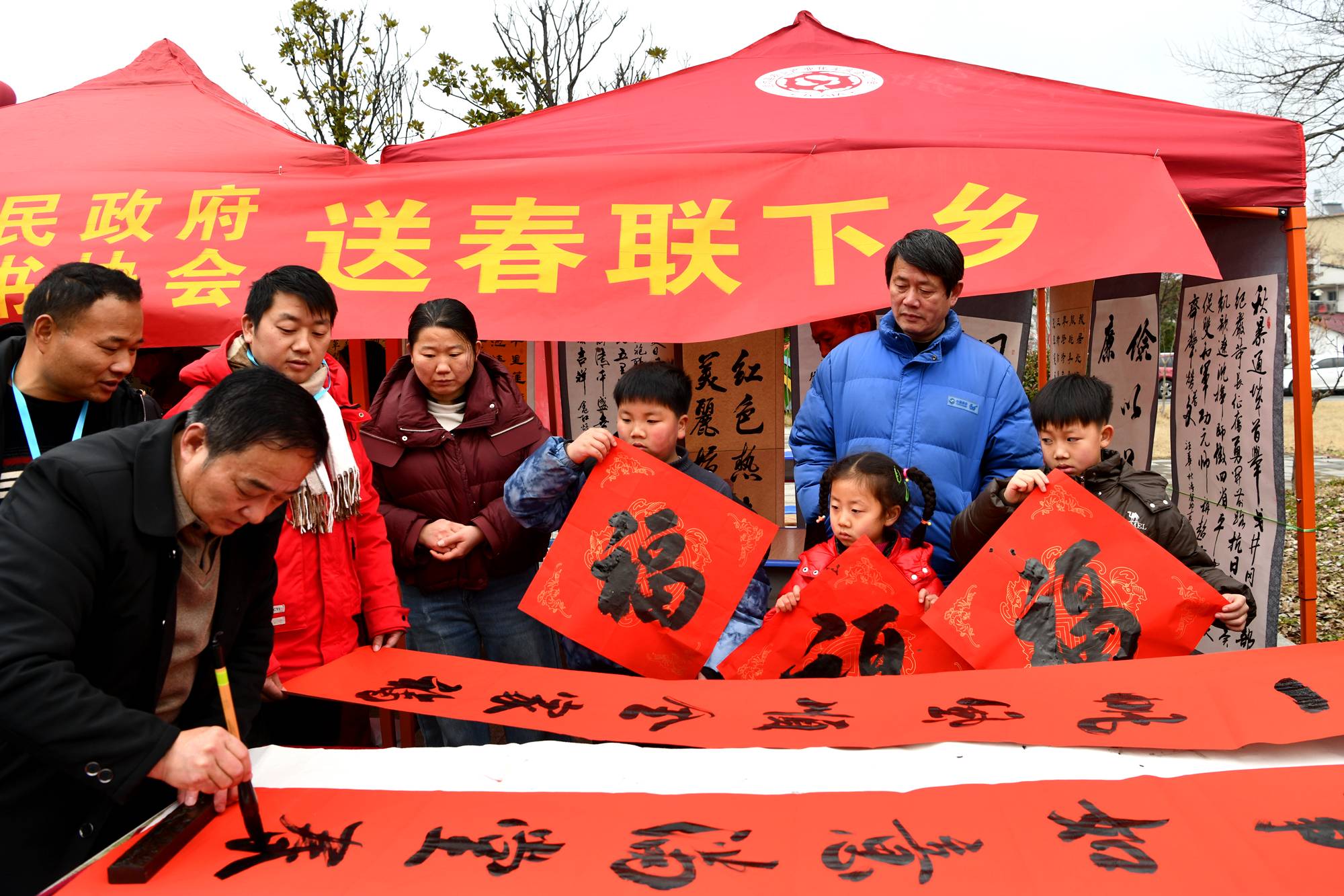 广场一侧,通城县书法协会的书法家们泼墨挥毫,一幅幅寓意吉祥的春联和“福”字在现场书写、赠送,移风易俗知识问答让文明理念随墨香传递。