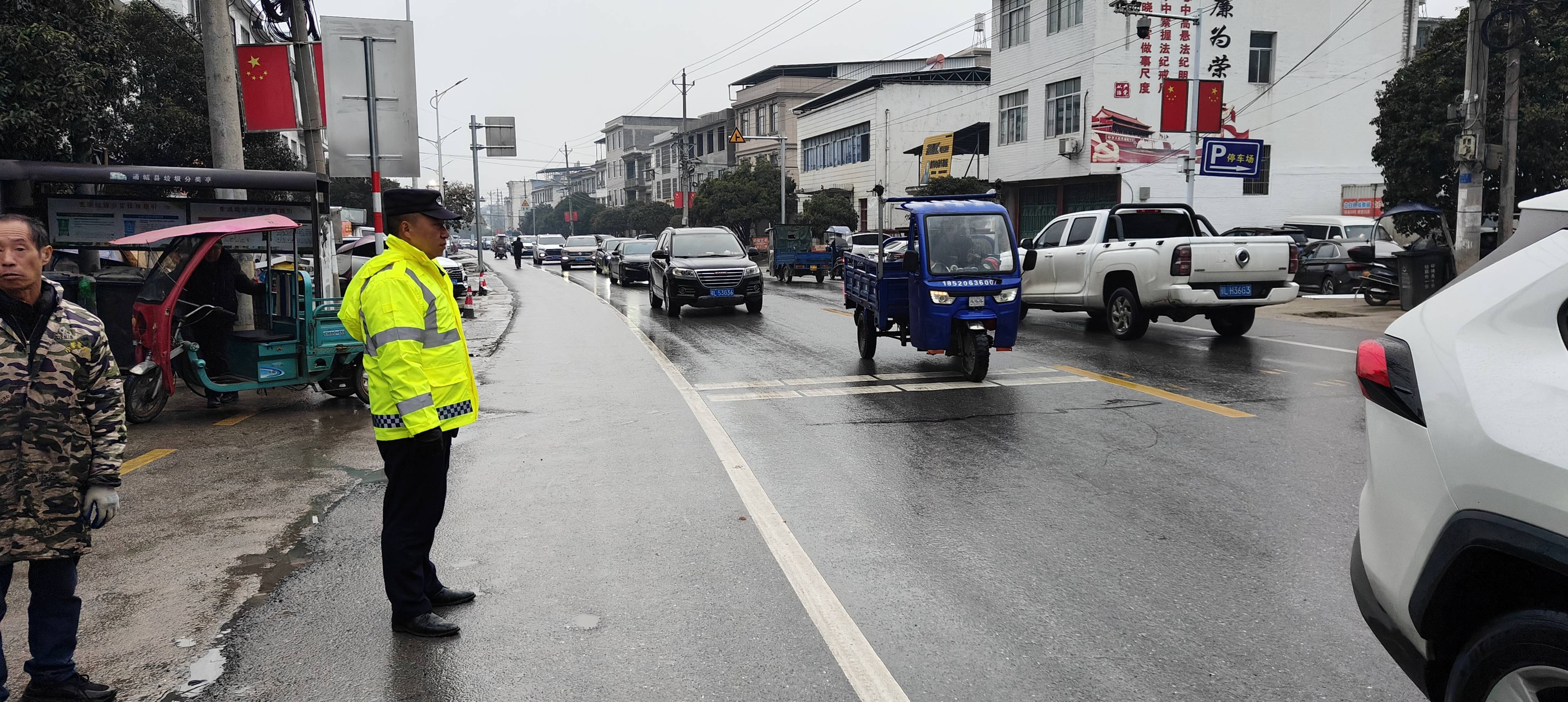 疏导工作中,30余名工作人员坚守岗位、分工协作,采取“定点值守+流动巡查”模式,全方位守护集镇交通秩序。在集镇主干道、十字路口、集市入口等车流、人流密集节点,工作人员身着反光背心,主动引导车辆减速慢行、有序停放,劝阻占道经营、随意穿行等不文明行为;高峰时段全员在岗在位,耐心解答群众出行咨询,引导群众合理规划出行路线,及时疏通拥堵路段,保障车辆行人通行有序。