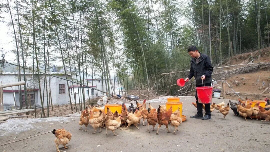 通城县马港镇金山村村民 聂益明:通过选择,我们考虑养生态散养土鸡,今年养了3000多只,经济效益都比较好,老百姓反映也不错,明年我们继续扩大规模来做这个事。