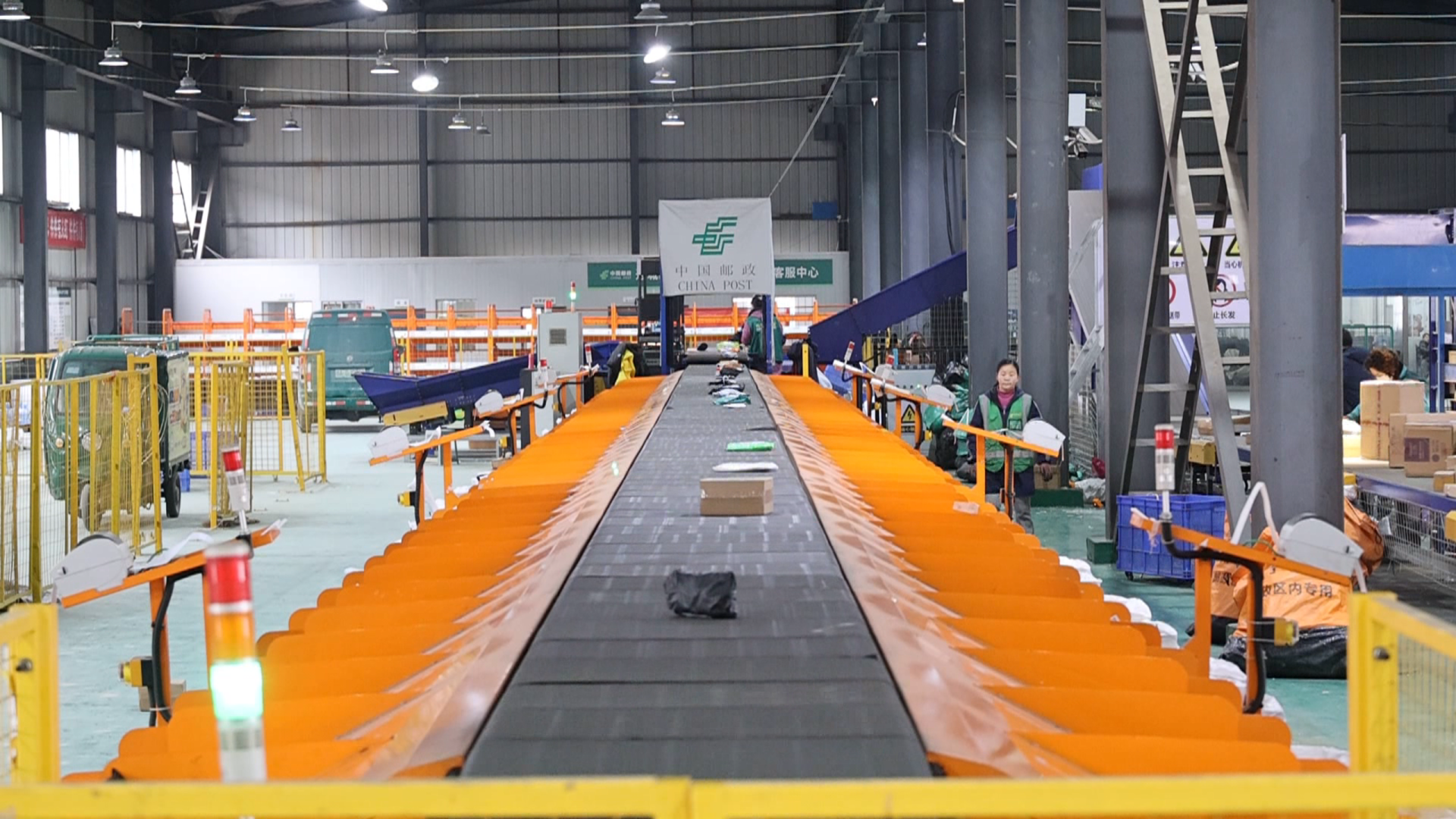 分拣线上,快递员金宇正在帮同事们一道分拣,他平均每天要派送约350件包裹,路线覆盖县城小区和周边乡镇。