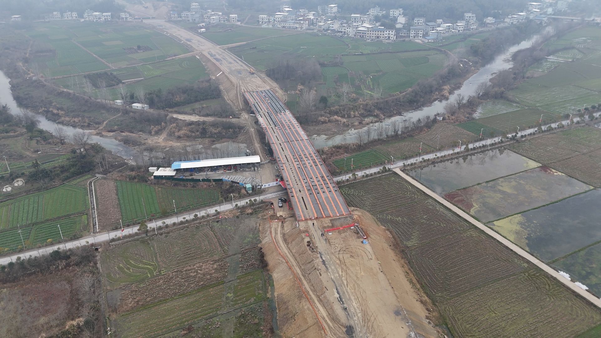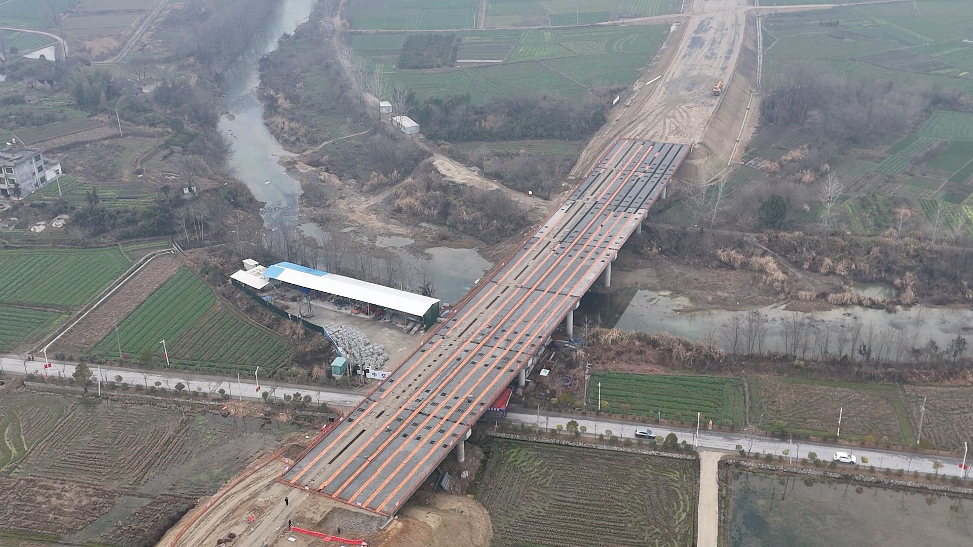 在关刀镇里港村段,新成型的路基如一条灰白色的缎带,在冬日田野间舒展。边坡齐整,边沟笔直,里港大桥飞架两岸。这片宏阔而静谧的工地,无声展示着历时数月的攻坚硕果。