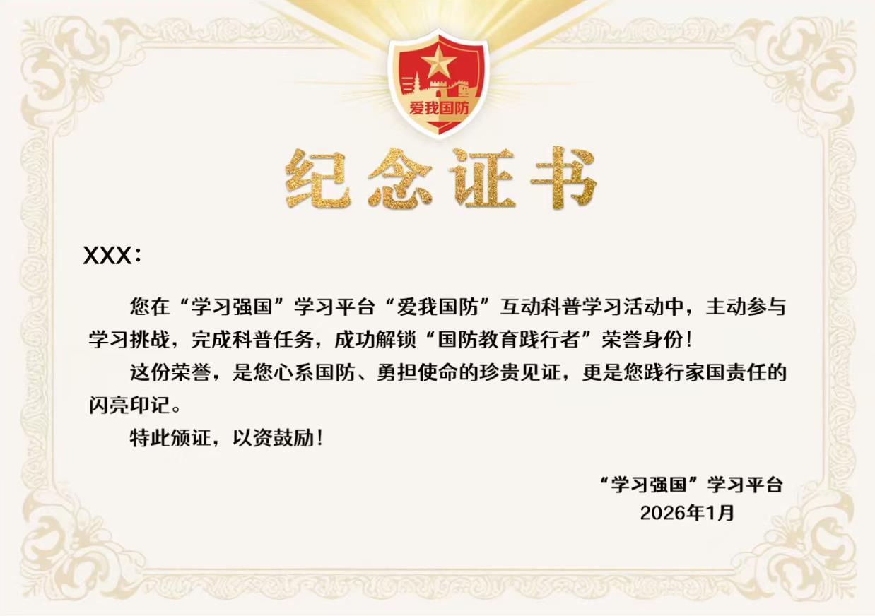 打开学习强国APP,找到《“爱我国防”趣味互动科普上线》文章,点击文末推荐阅读卡片,即刻进入互动答题专区。完成全部问答挑战的用户,将获得“国防教育践行者”电子纪念证书,以作表彰与激励。
