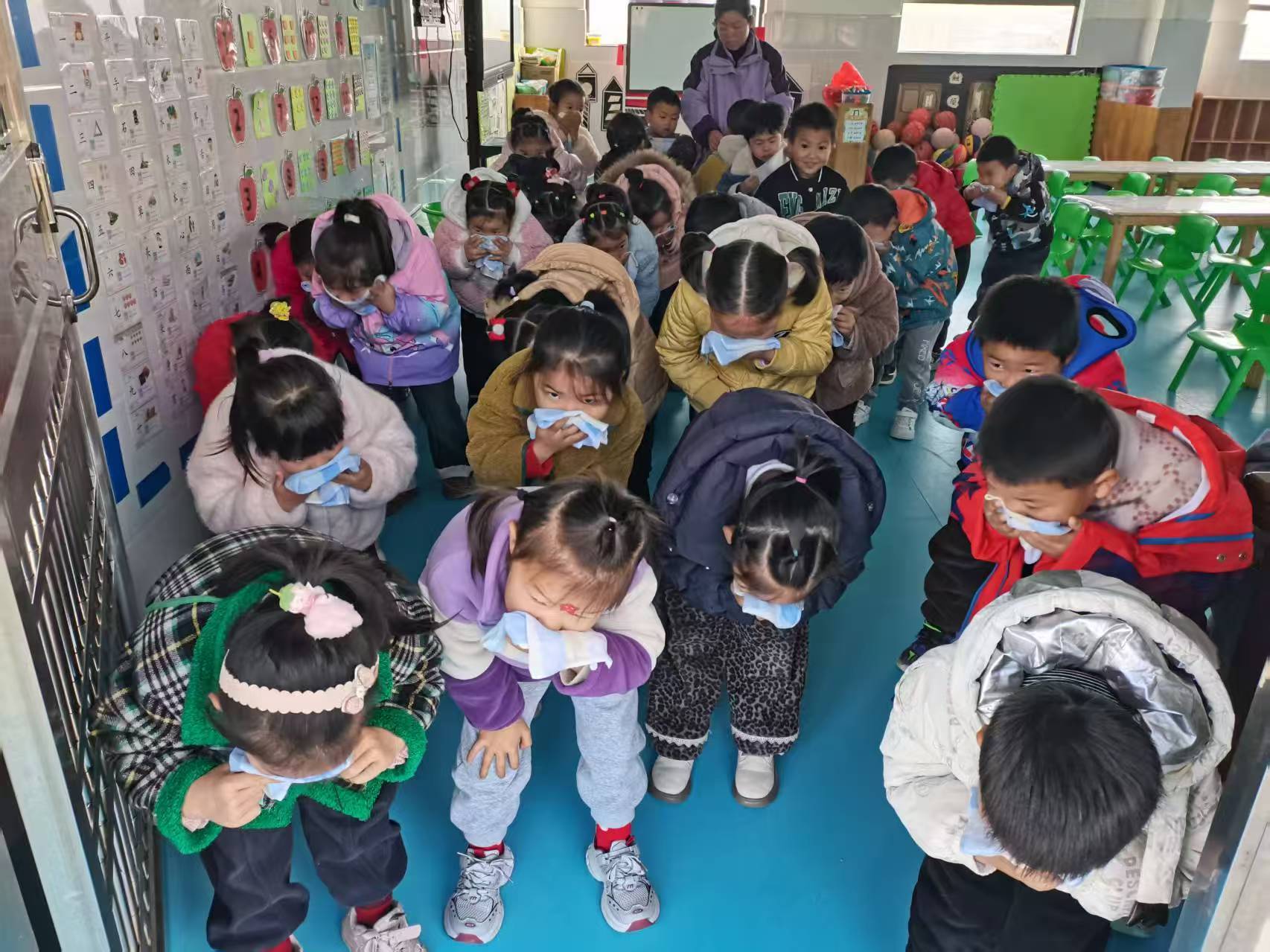 随着一阵急促的警报声划破校园的宁静,消防安全应急疏散演练正式启动。各班教师迅速反应,引导幼儿用湿毛巾捂住口鼻,弯腰低姿沿着预定路线快速前行。孩子们在老师的带领下,井然有序地撤离至安全集结点。抵达安全区域后,各班教师第一时间清点人数并向安全员汇报,确保全体师幼无一遗漏。