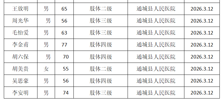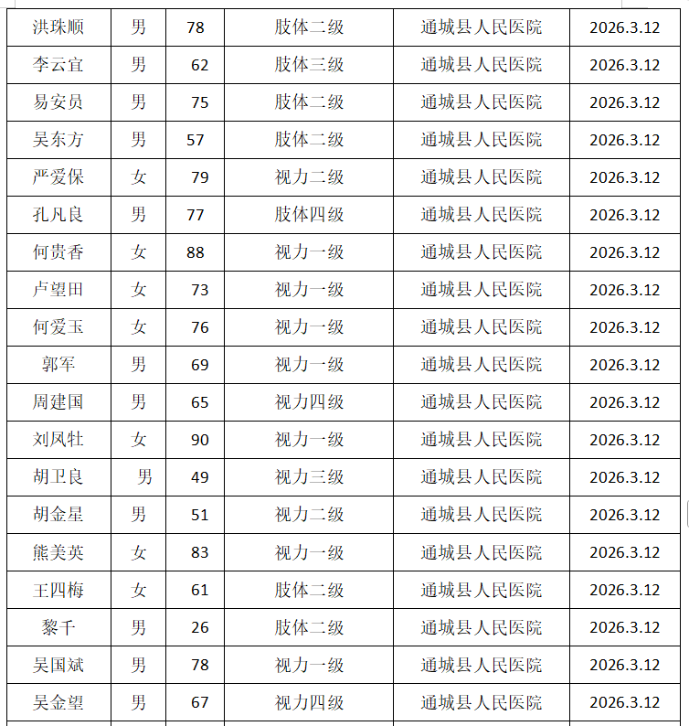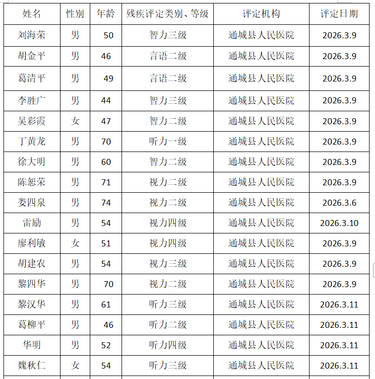 公示时间为: 2026年3月12日~ 2026 年3月19日(5个工作日)。请对照《残疾人残疾分类和分级》(GB/T26341-2010),如认为公示对象不符合残疾标准,或评定过程存在弄虚作假行为,可在公示期间向通城县残联反映。联系电话:0715-4338773 联系地址:通城县隽水镇城西新区县残联办公室(邮编437400)。