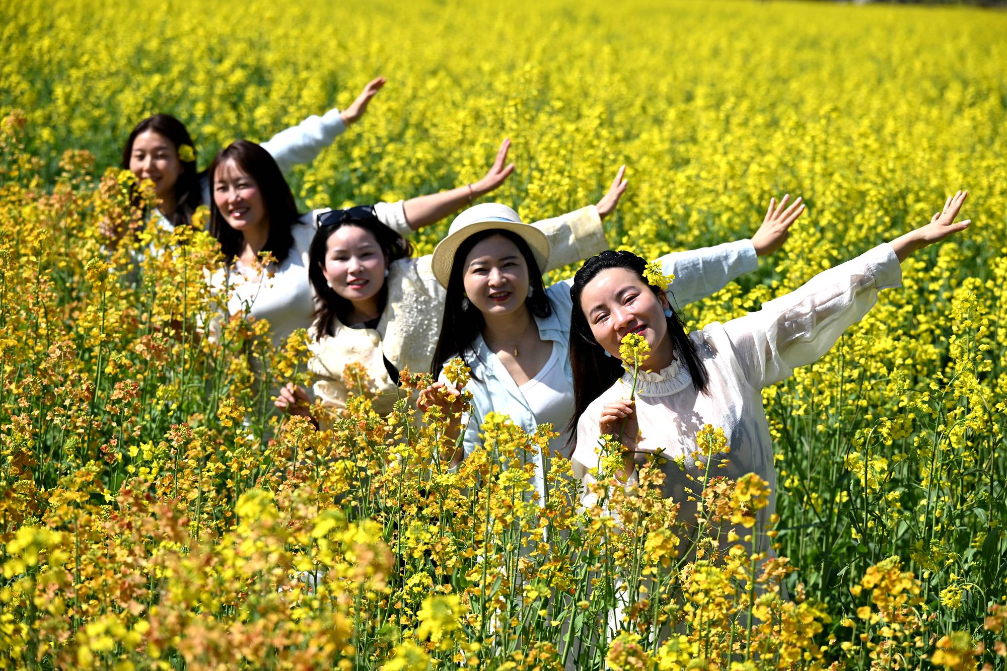 初春时节,湖北省咸宁市通城县塘湖镇龙印村千亩高产油菜示范基地油菜花盛开,吸引众多游客踏青游玩,赏花拍照,拍摄抖音,乐享春日田园时光。