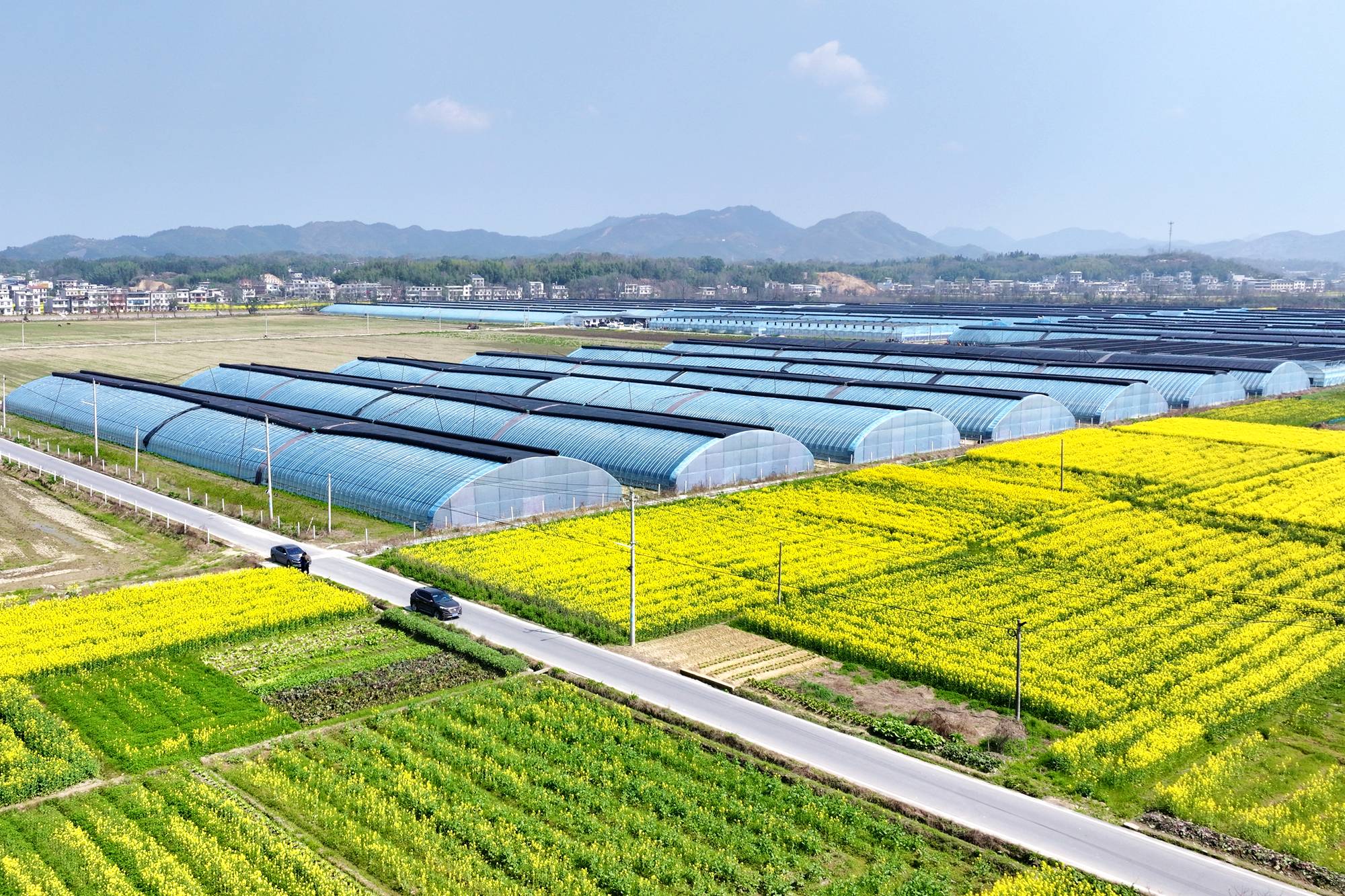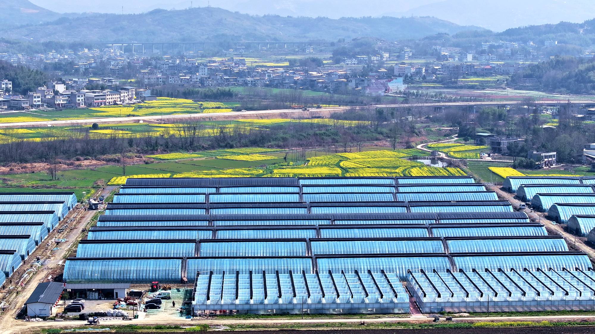 2026年3月12日,在湖北省咸宁市通城县关刀镇新畈千亩蔬菜基地,数控智能大棚内外春意盎然。棚外油菜花金黄一片,棚内村民们正抢抓农时,熟练运用一体化机械进行播种作业。