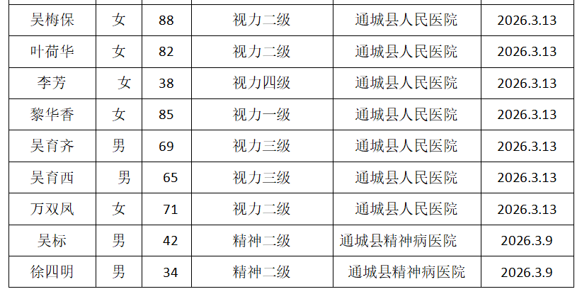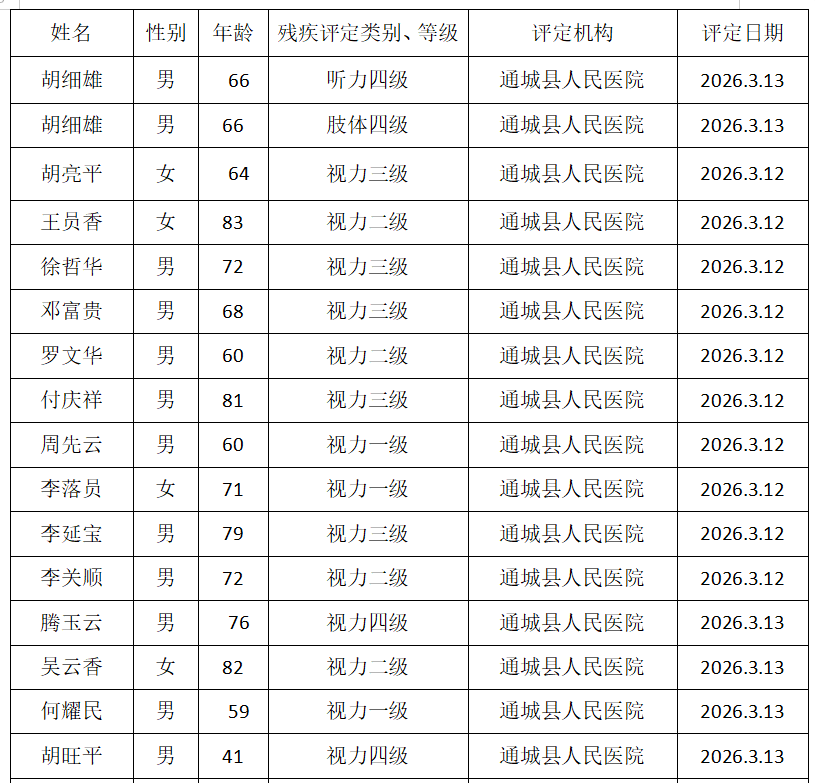 公示时间为: 2026年3月13日~ 2026 年3月20日(5个工作日)。请对照《残疾人残疾分类和分级》(GB/T26341-2010),如认为公示对象不符合残疾标准,或评定过程存在弄虚作假行为,可在公示期间向通城县残联反映。联系电话:0715-4338773 联系地址:通城县隽水镇城西新区县残联办公室(邮编437400)。