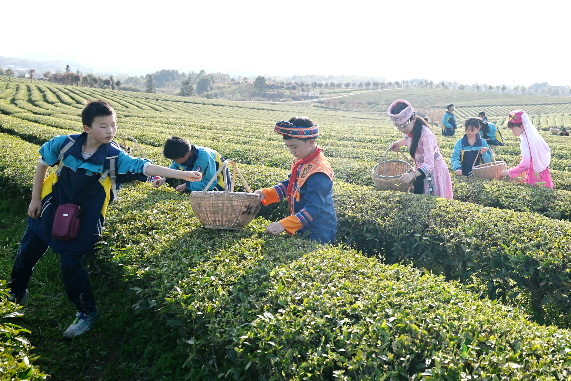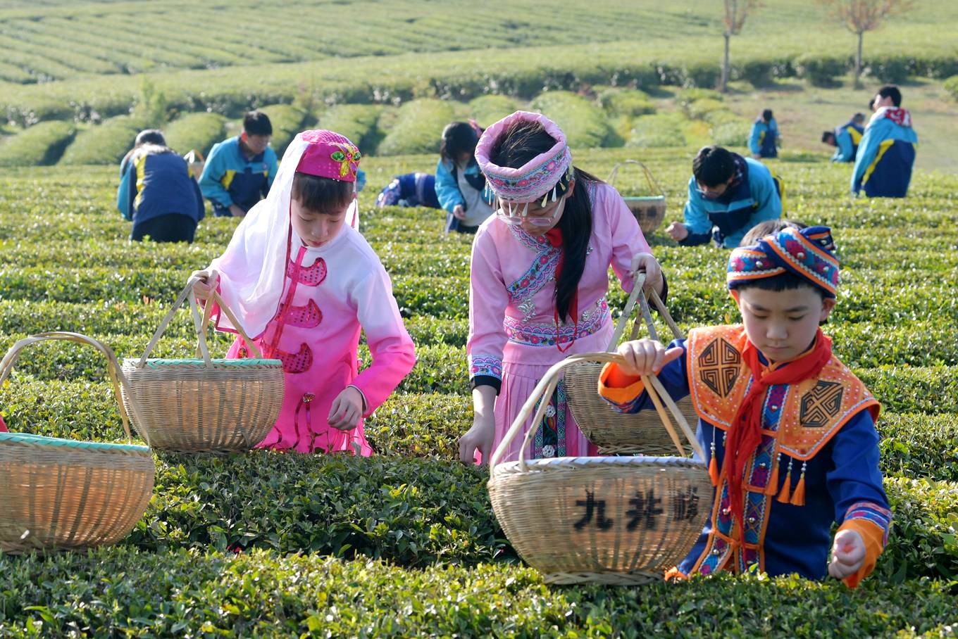时下正是春茶采摘季节,通城县实验学校组织少数民族学生,身着少数民族服饰走进沙堆九井峰茶园,开展社会实践活动,近距离感受农事,增长农事知识,体验劳作的辛苦与快乐,学习采茶相关知识,开展 “采茶小能手” 竞赛。