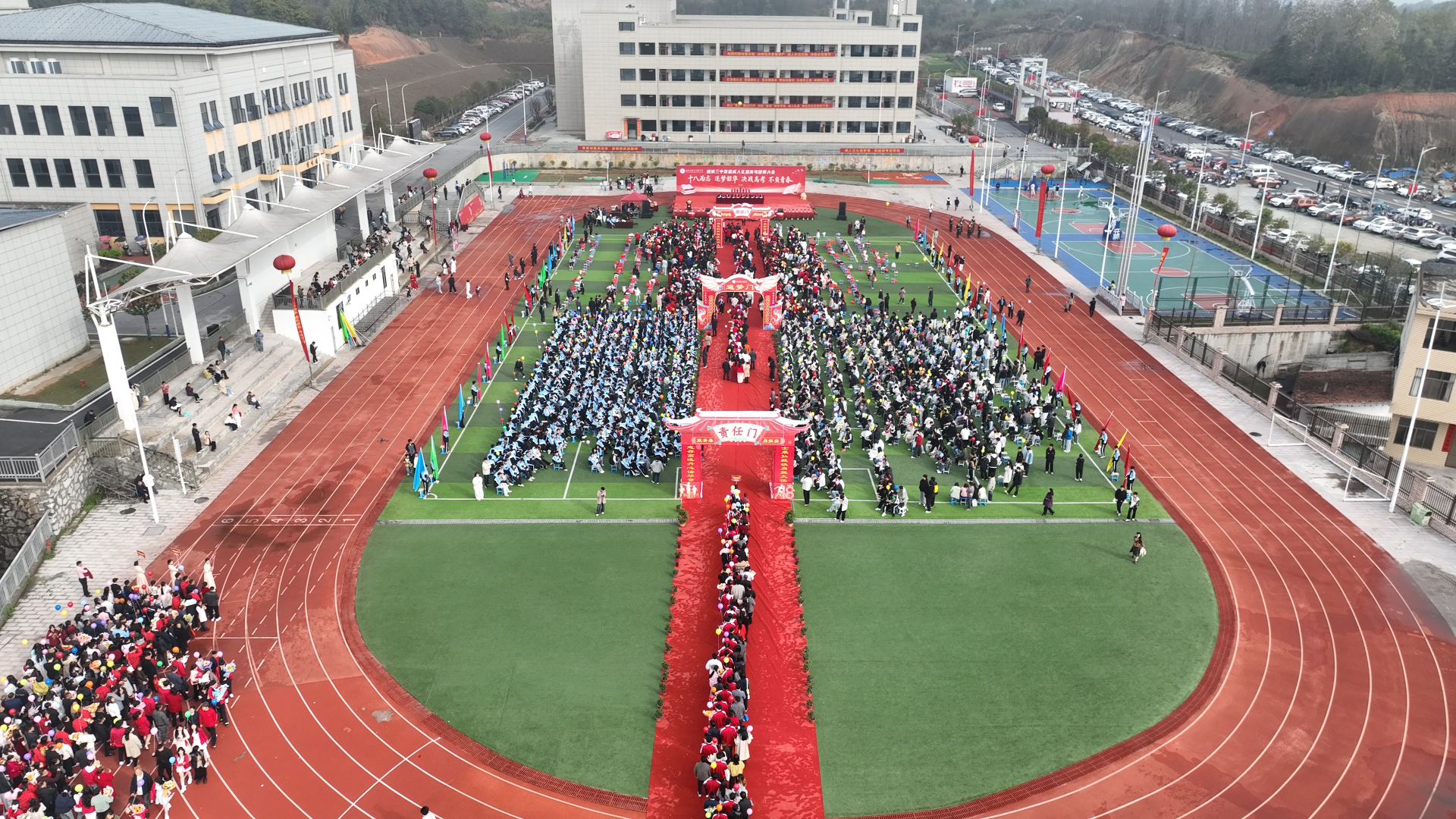 活动在激昂的“鼓舞三中”开场舞中拉开帷幕,铿锵鼓点与飒爽舞姿充分展现了三中师生昂扬向上的精神风貌。高三各班学生与家长携手并肩、步履坚定,依次穿过“责任门”“追梦门”“凯旋门”。每一道门,都镌刻着成长的印记、父母的期望与对未来的向往;每一步,都激荡着少年的锐气与青年的担当。