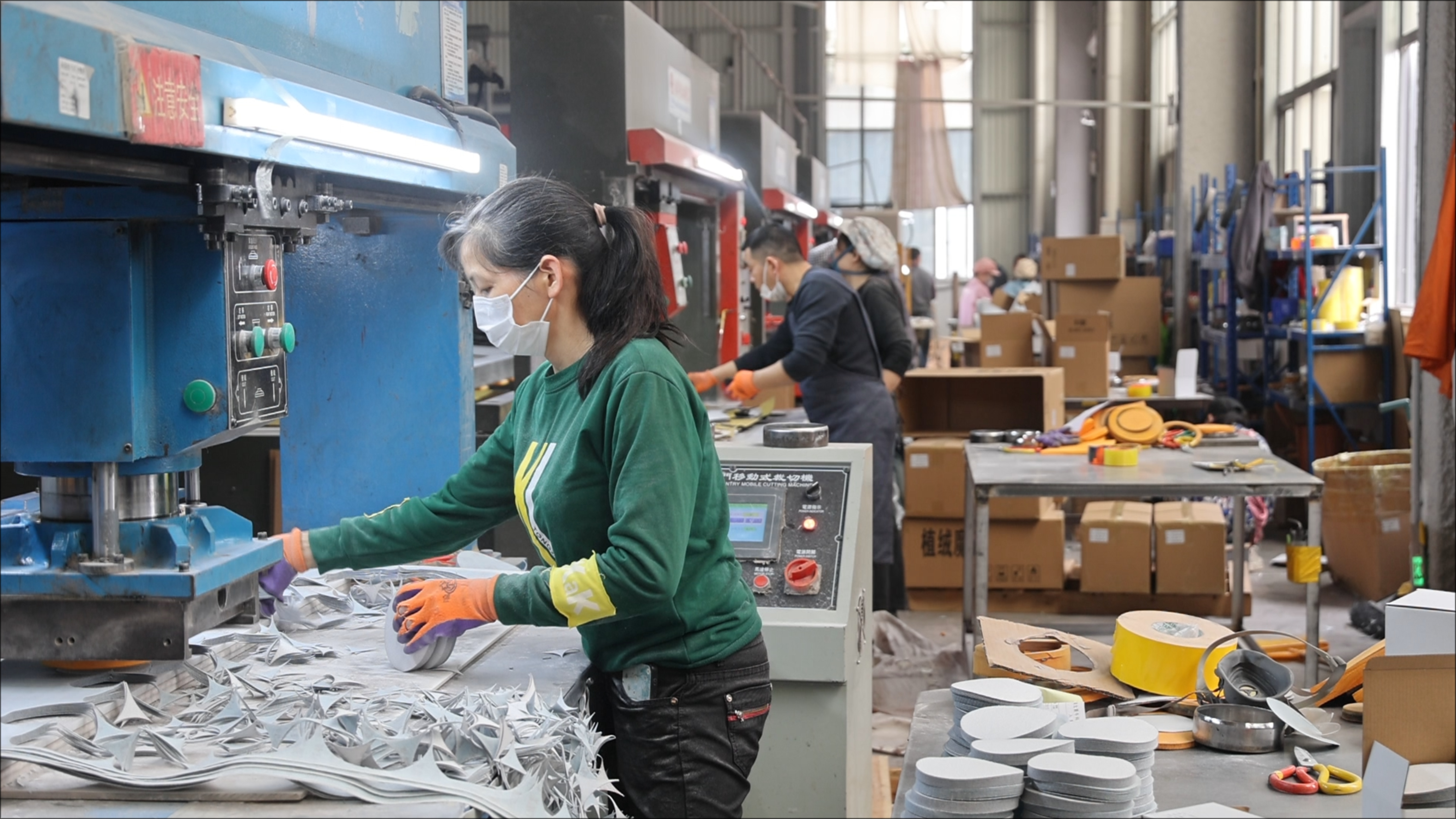 “根据不同用途,我们开发了植绒砂纸、背胶砂纸、异形砂纸、水磨砂纸、聚酯薄膜、百洁布、海绵砂纸、海绵磨块等上十种研磨制品,应用场景包括金属加工、木材加工、皮革处理、玻璃打磨等。因为产品线丰富、产品质量有保障,公司生产的产品不仅在国内销售,还出口到欧美、中东、东南亚等国际市场,并且国外市场还有逐年扩大的趋势。”公司总经理李伟雄说。
