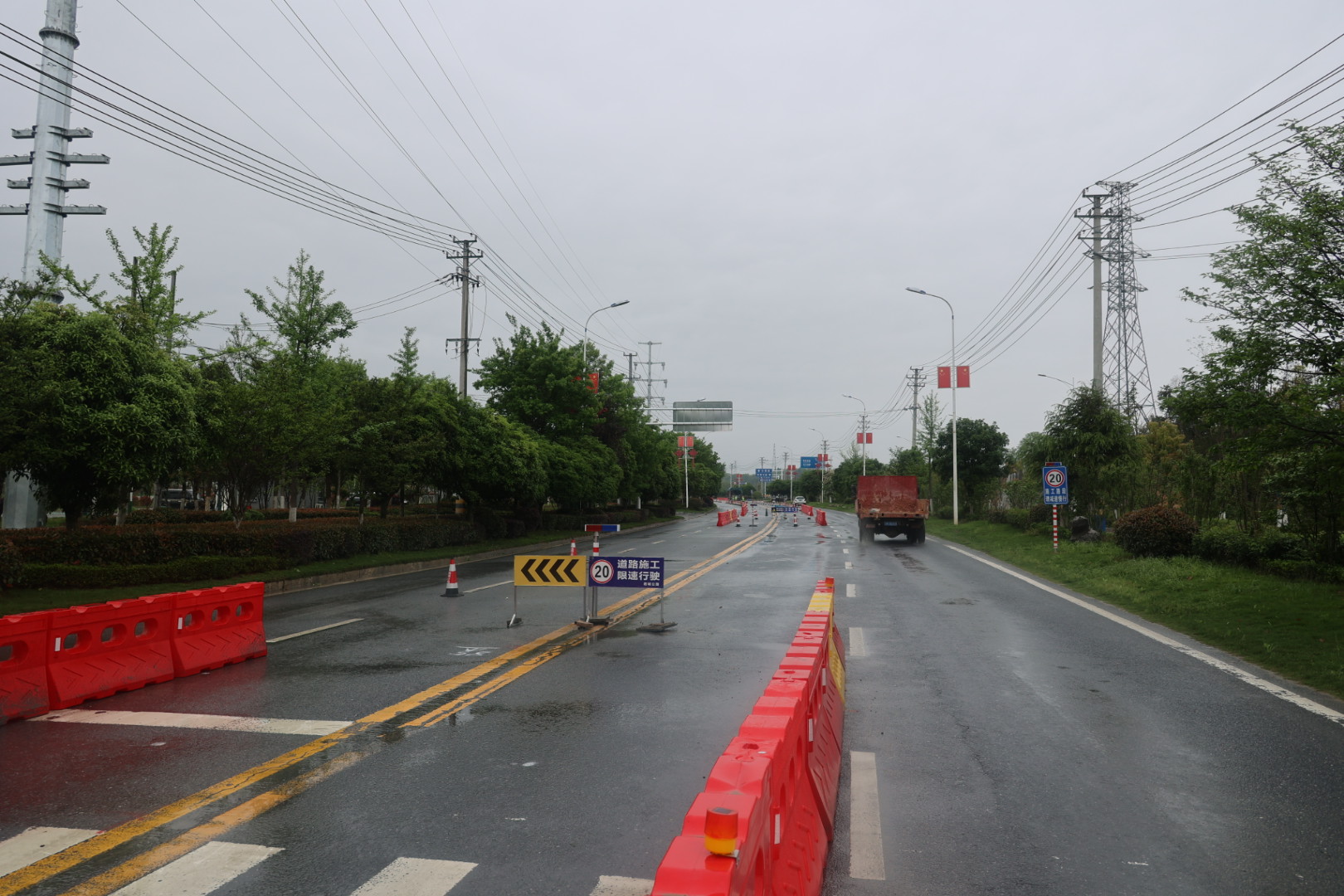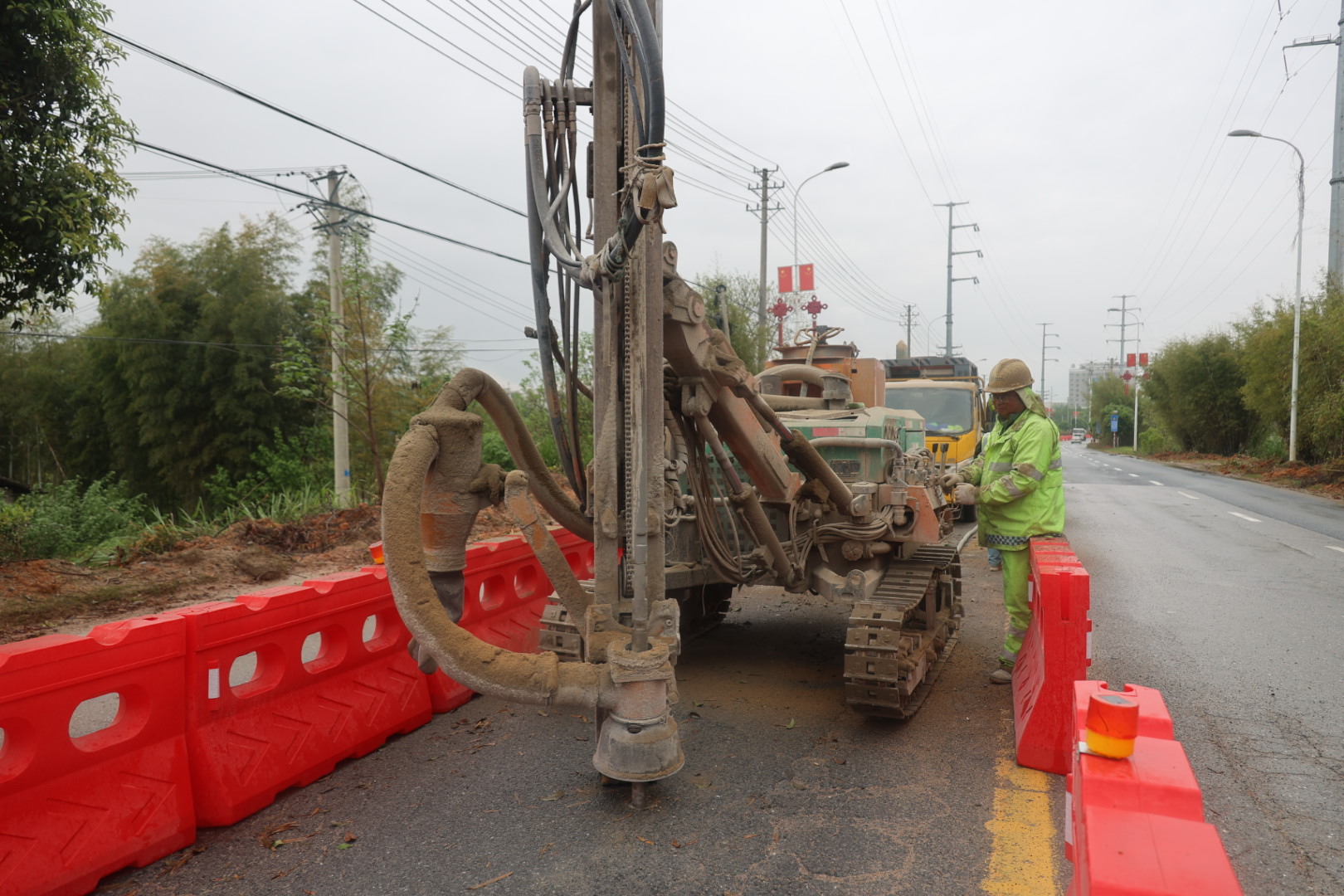 4月14日,在通城大道改造工程施工现场一派繁忙景象。尽管天空下着细雨,工人们依然分工协作,分段对破损路面进行水泥注浆,大型机械同步运行,洒水车实时降尘,最大限度减少施工对环境的影响。