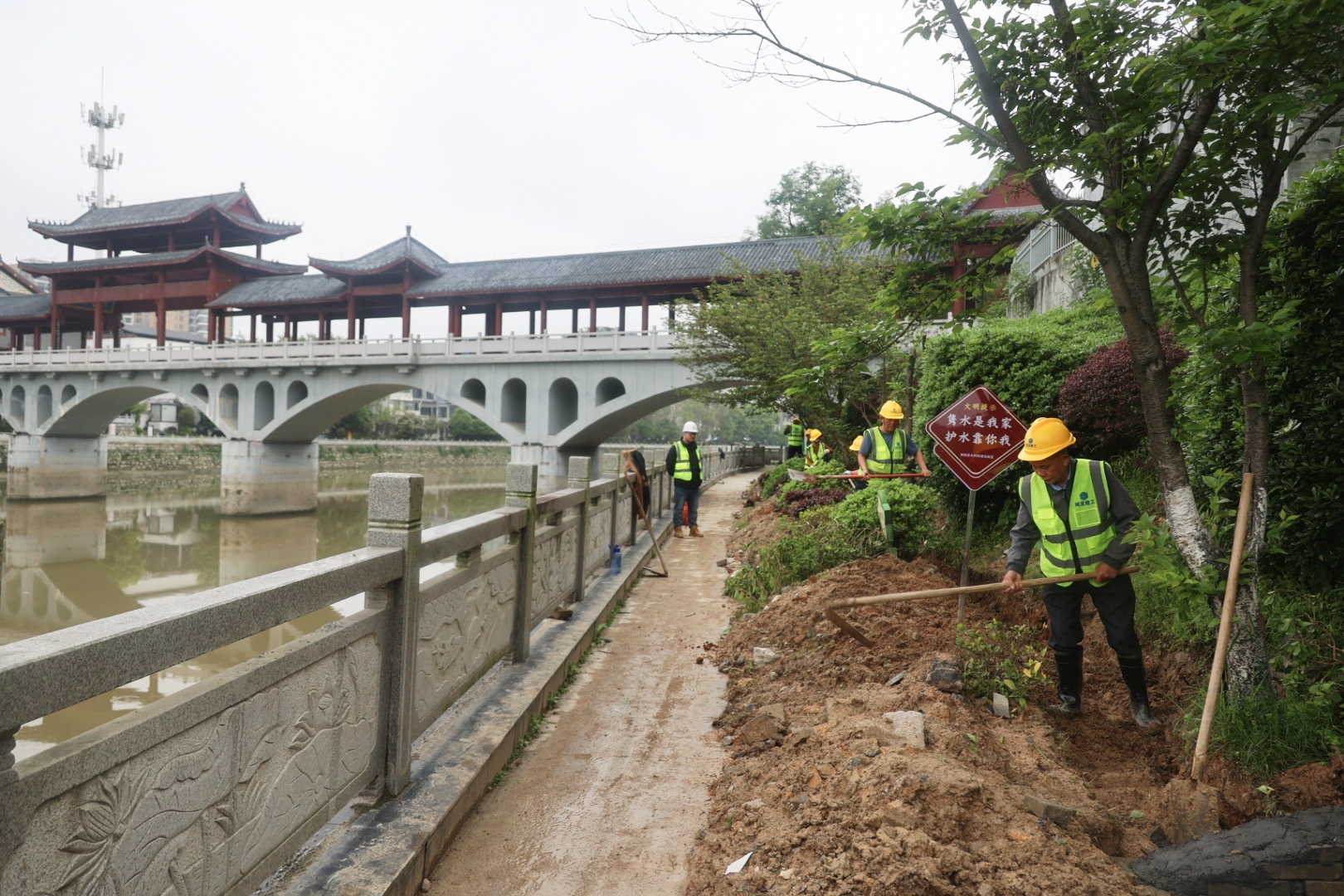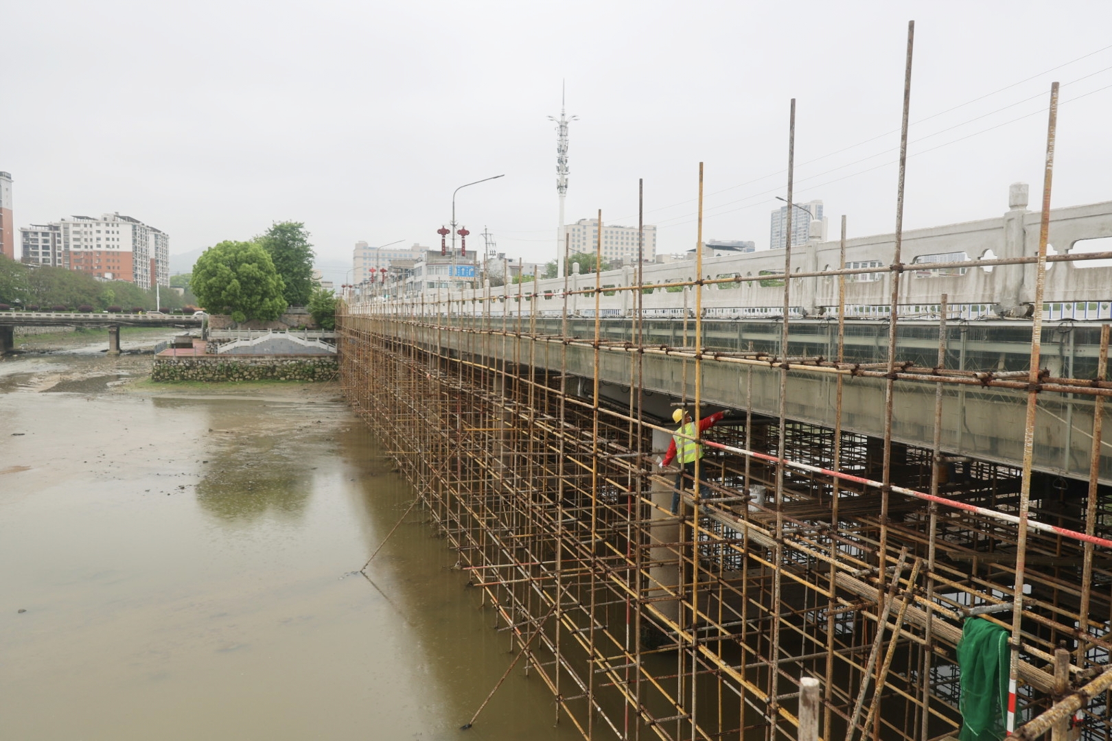 在雁塔桥下,施工人员借助脚手架,对桥底因长期风雨侵蚀形成的陈旧面层进行粉刷翻新,擦亮滨水景观带风貌底色。