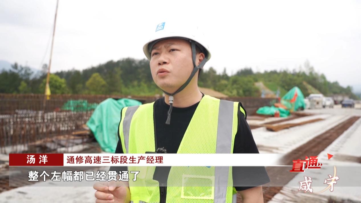 通修高速三标段生产经理 汤洋:文家屋和坳上两个大桥,整个左幅都已经贯通了,桥面都已经架完,现在架的是右幅的文家屋大桥,高峰的时候,应该会上到50至60个人的样子。