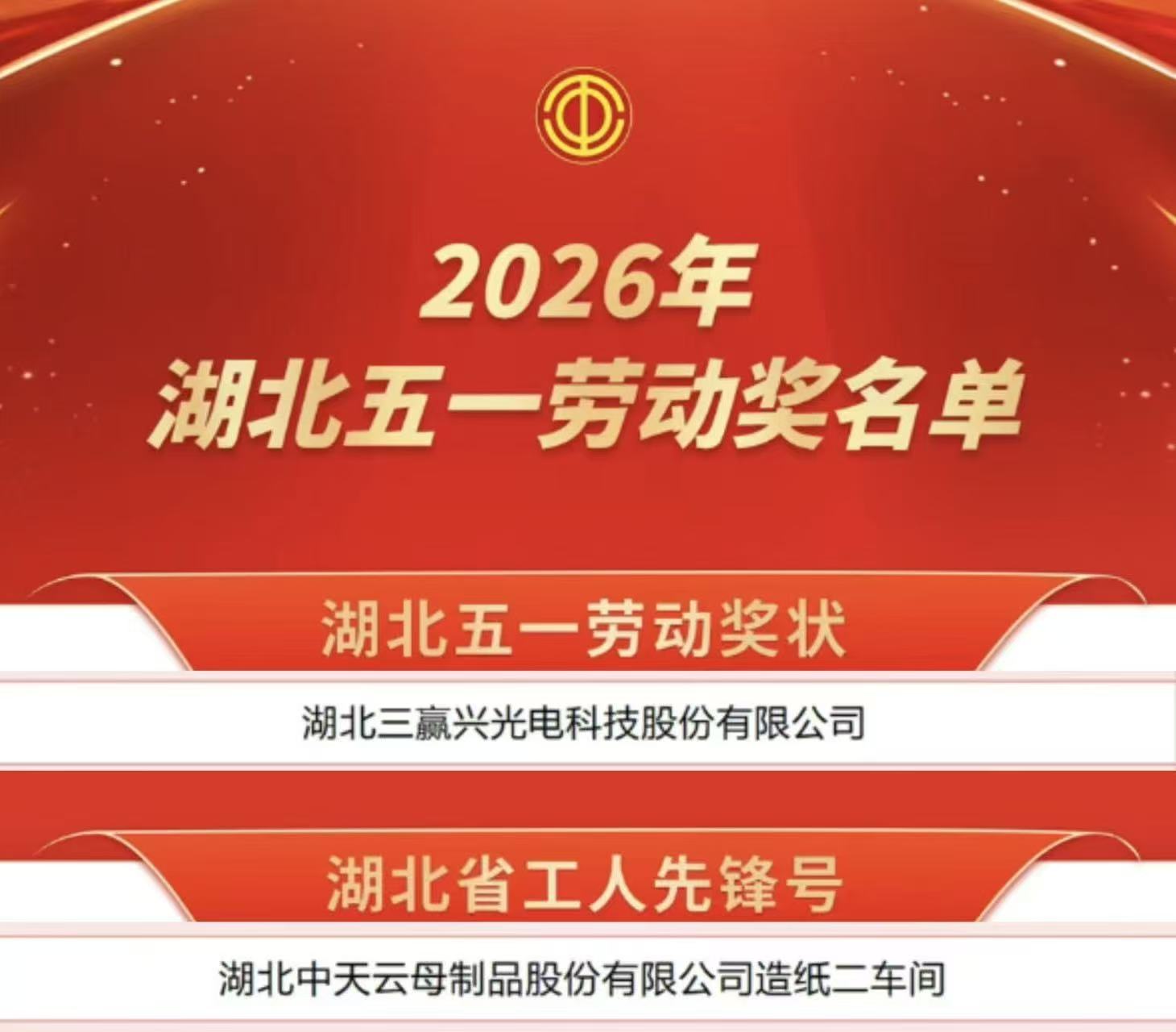 【通讯员 丁莺莹 万秀丽】4月29日,在“五一”国际劳动节来临之际,湖北省总工会发布《2026年湖北五一劳动奖名单》,通城县工业企业捷报频传。湖北三赢兴光电科技股份有限公司被授予“湖北省五一劳动奖状”荣誉称号,湖北中天云母制品股份有限公司造纸二车间被授予“湖北省工人先锋号”荣誉称号。