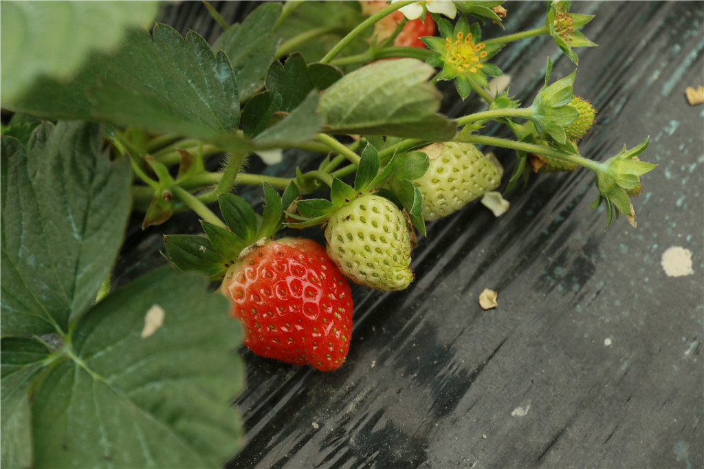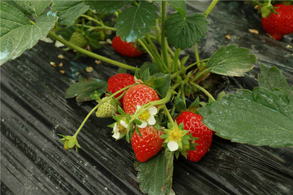 满目葱茏的翠绿植株上,朵朵白花零星散落,鲜红欲滴、果肉饱满的草莓点缀其间,十分惹人喜爱。